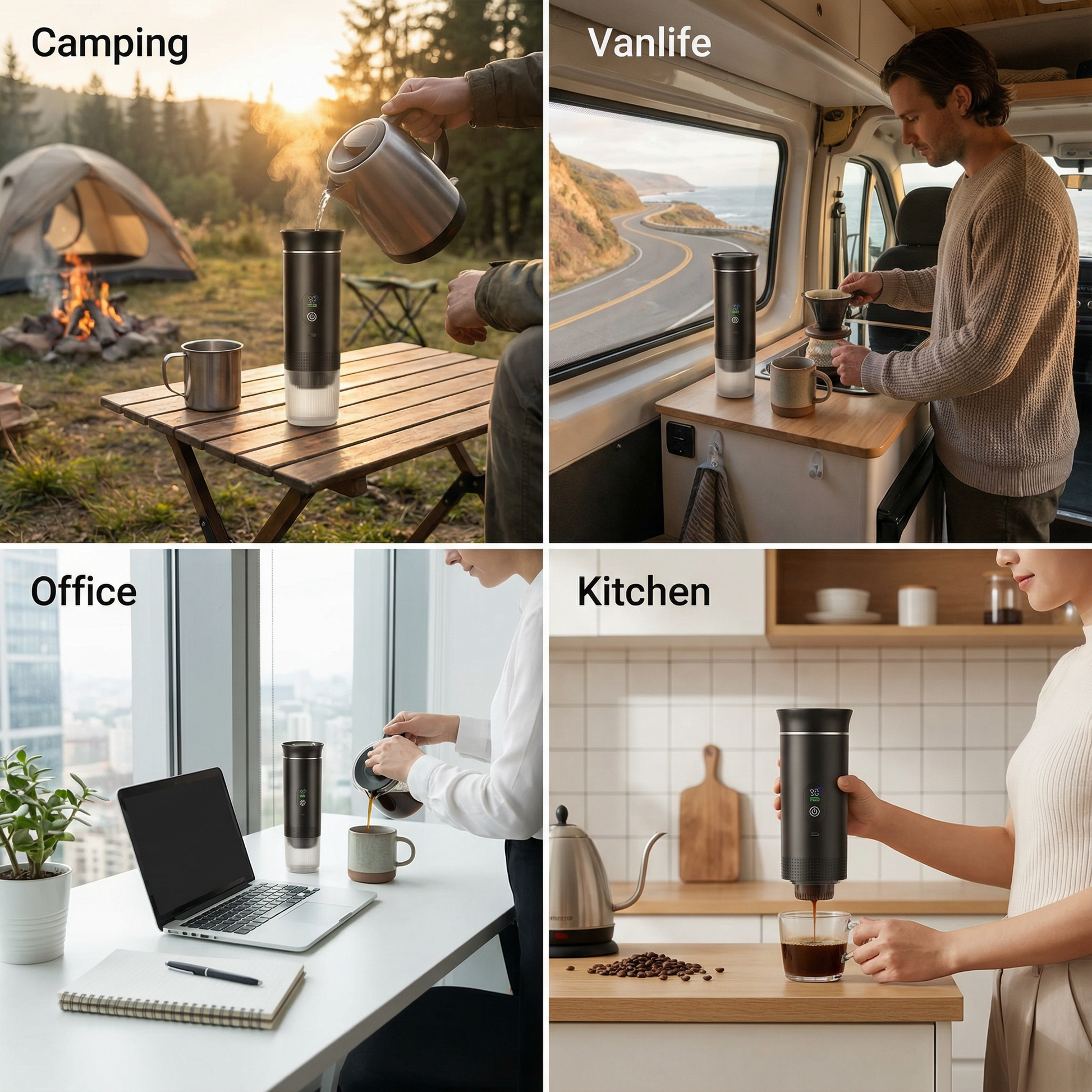 Ideal for camping, hiking breaks, office use, road trips, and van life — your coffee routine, uninterrupted.
